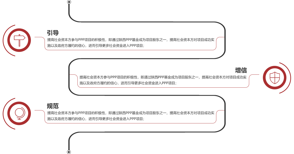 2016年3月5日,李克強總理在《政府工作報告》中要求“完善政府和社會(huì )資本合作模式,用好1800億元引導基金,依法嚴格履行合同,充分激發(fā)社會(huì )資本參與熱情”中國PPP基金充分貫徹國務(wù)院指導精神,以“引導、增信、規范”為己任。在此基礎上陜西PPP基金以省級“引導基金”為定位,旨在帶動(dòng)推動(dòng)陜西省PPP項目的實(shí)施落地。