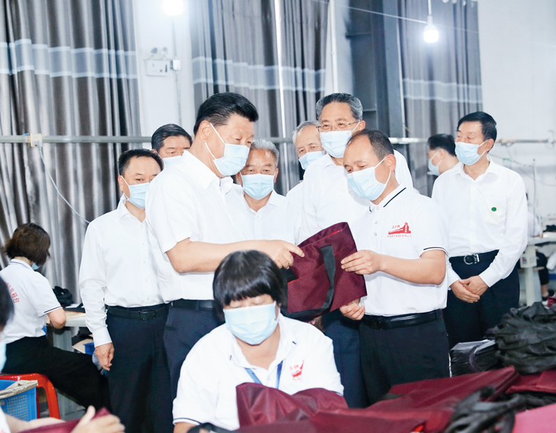 2020年8月18日至21日,中共中央總書(shū)記、國家主席、中央軍委主席習近平在安徽省考察。這是18日下午,習近平在阜陽(yáng)市阜南縣紅亮箱包有限公司察看車(chē)間生產(chǎn)線(xiàn),了解企業(yè)災后恢復生產(chǎn)和受災群眾、貧困群眾就業(yè)情況。 新華社記者 鞠鵬/攝